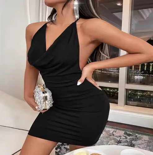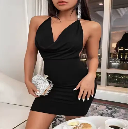 Summer Sweet Style Mini Dress for Women Solid Spaghetti Strap Backless Sleeveless Natural Waistline Sequined Eco-Friendly Fabric